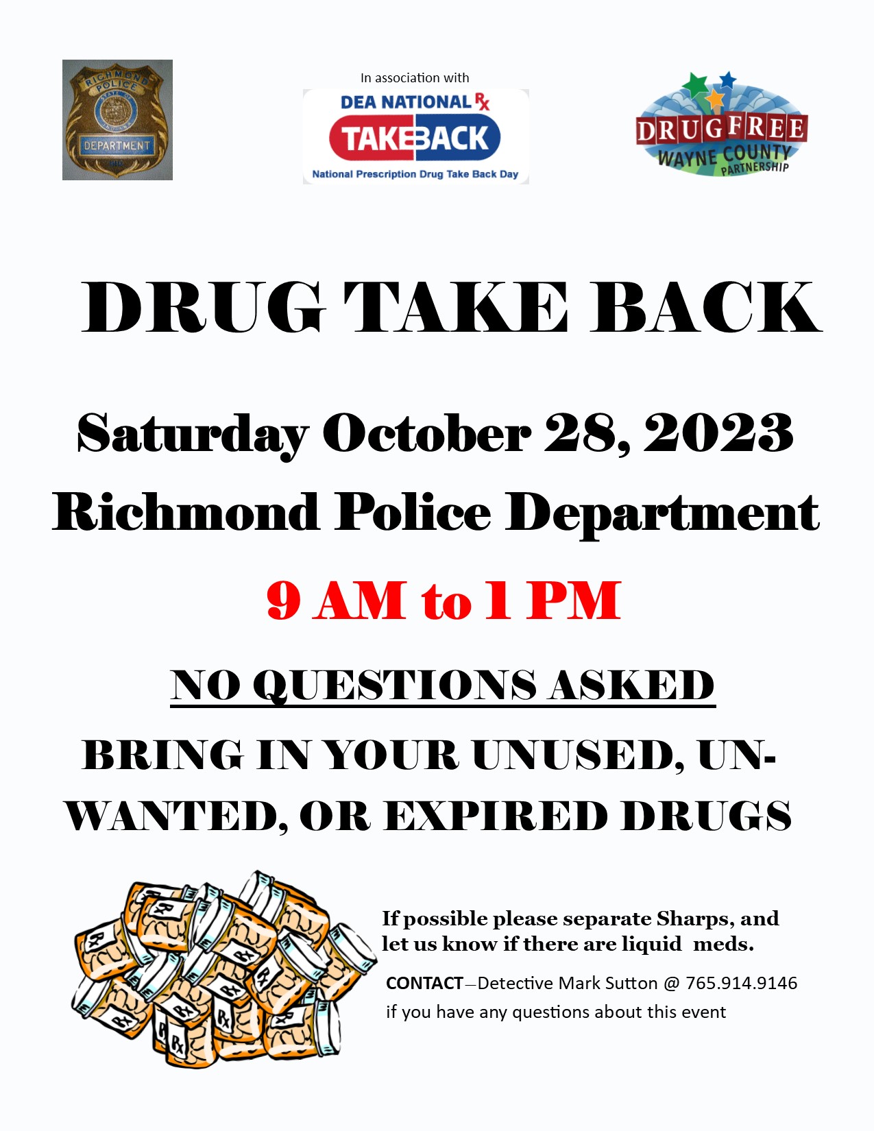 The Richmond Police Department will be hosting the annual fall Drug Take Back event Saturday, October 28, 2023 from 9AM-1PM. Drop off is at the Richmond Police Department located at 50 North 5th Street, Richmond, In 47374.