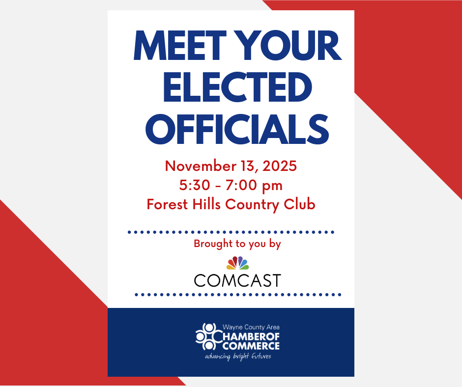 Connect with elected leaders from Wayne County, the region, and the state at this special networking event. Officials will be invited to introduce themselves and mingle with guests. Light hors d’oeuvres will be provided, and a cash bar will be available. Event sponsored by Comcast.