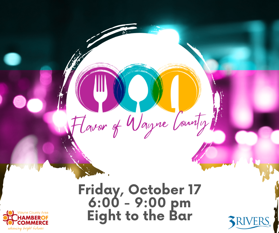 We are excited to announce Flavor of Wayne County, brought to you by 3Rivers Credit Union, will be happening Friday, October 17th at 6pm…at a new location – Eight to the Bar in downtown Richmond! Guests 21 and over will enjoy a fun event at a unique location. There will be samples from many of our favorite, locally-owned restaurants, live music from The Sean Lamb and Janet Miller Band, and much more!