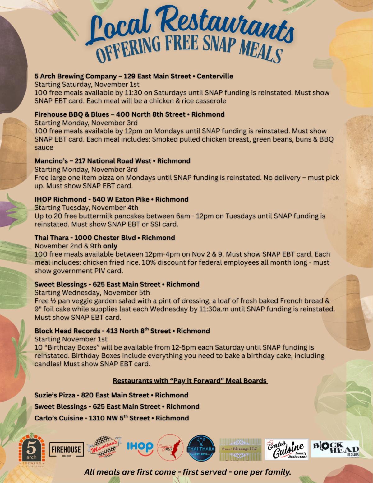 As you may have seen, a temporary delay in November SNAP funding will impact families across our community who rely on this vital assistance. In response, several local restaurants have stepped up in an incredible way — offering free community meals to SNAP recipients during this time.