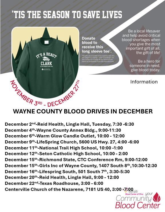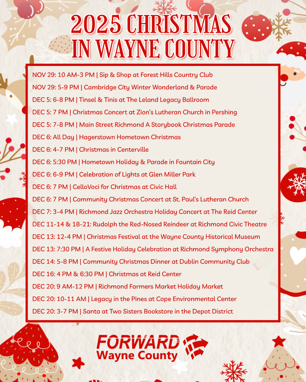 Around the Chamber November 21, 2025November 28, 2025Information supplied by Wayne County Area Chamber of Commerce Many things happening in Wayne County | Holiday Festivities Click on the graphics in this email to view more information about the events. Join us on the next Chamber trip in June 2026 and visit Greece, Turkey, Malta and Spain! Click HERE for more trip info! Wayne County Area Chamber of Commerce | 33 South 7th Street, Suite 2 | Richmond, IN 47374 US
